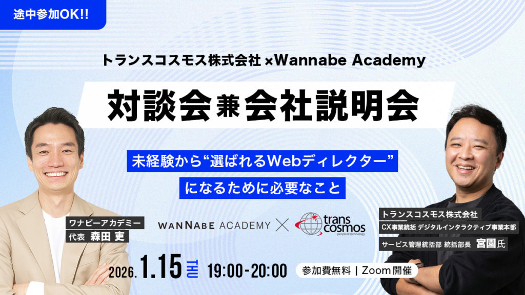 トランスコスモス × Wannabe Academy 特別対談+採用会社説明会 Webディレクターは、「制作ができる人」だけでは評価されません。 では、企業はWebディレクターの“何”を見て採用しているのでしょうか。 2026年1月、 トランスコスモス株式会... -