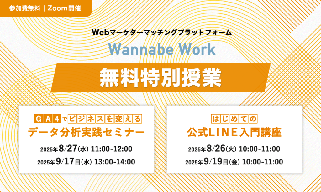 このたび、Webマーケターマッチングプラットフォーム【Wannabe Work】(ワナビーワーク)が、 今すぐ使えるデジタル集客の基本を学べる「無料特別授業」を開催いたします! 【GA4でビジネスを変える データ分析実践セミナー】 <内容> ・GA4で見るべ... -