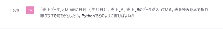 以下のように指示を入力します。今回はPythonのPandasを使用したいのでPythonを指定します。具体的に指示を出すとより正確にChatGPTがコードを生成します。