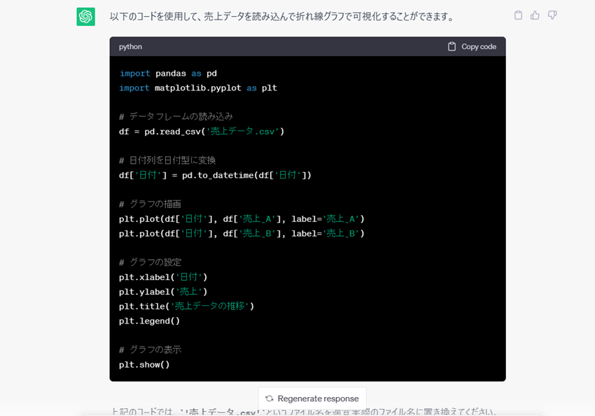 csv形式のデータを読み込んで可視化するグラフのコードも生成できます。