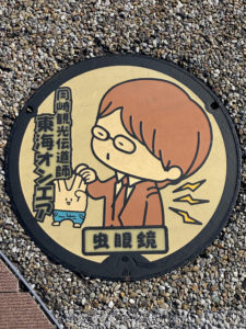 レンタカー屋さんの多い岡崎駅近くにある虫眼鏡のマンホールからスタート!地面に馴染む茶色カラーのため、見逃さないようにじっくり公園内を散策してくださいね。