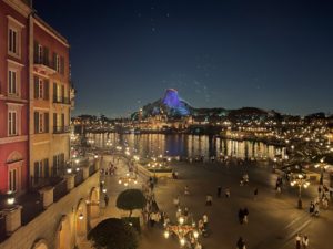 東京ディズニーシーのエントランス側のエリア、お部屋によってディズニーシーのシンボル「アクアスフィア」を臨むことも。