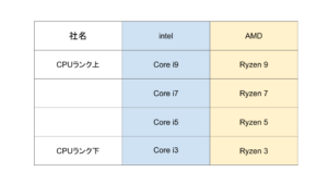 まずCPUにはintel(Core i)とAMD(Ryzen)という2社の製品があります。