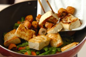 - 豆腐を加え、醤油で味付けし、さらに炒めます。