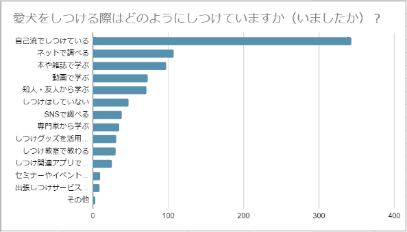 「専門家(ブリーダー、ドッグトレーナー)」や「しつけ教室」などの専門家から直接学んでいる方は少なく、やはり費用がかかることから最終手段として利用されているようですね。