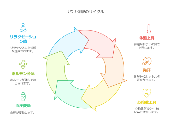 サウナに入ると、体内でさまざまな生理的変化が起きます。この変化がリラックス感や「整い」を生み出す原理です!この「整う感覚」は、科学的に多くの研究によって裏付けられており、主に自律神経の調整や脳内のホルモン分泌によって生じます!