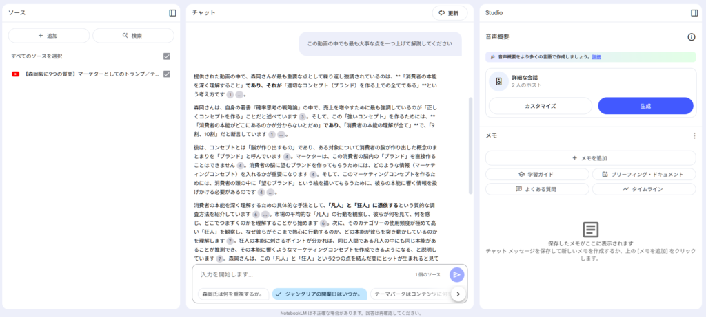 そんな時でもNotebookLMを使えば下の画像のように要約や大事なポイントの解説をしてくれます。しかも、全ての回答は動画の情報を基に出力されるので、正しい情報を得ることができます!
