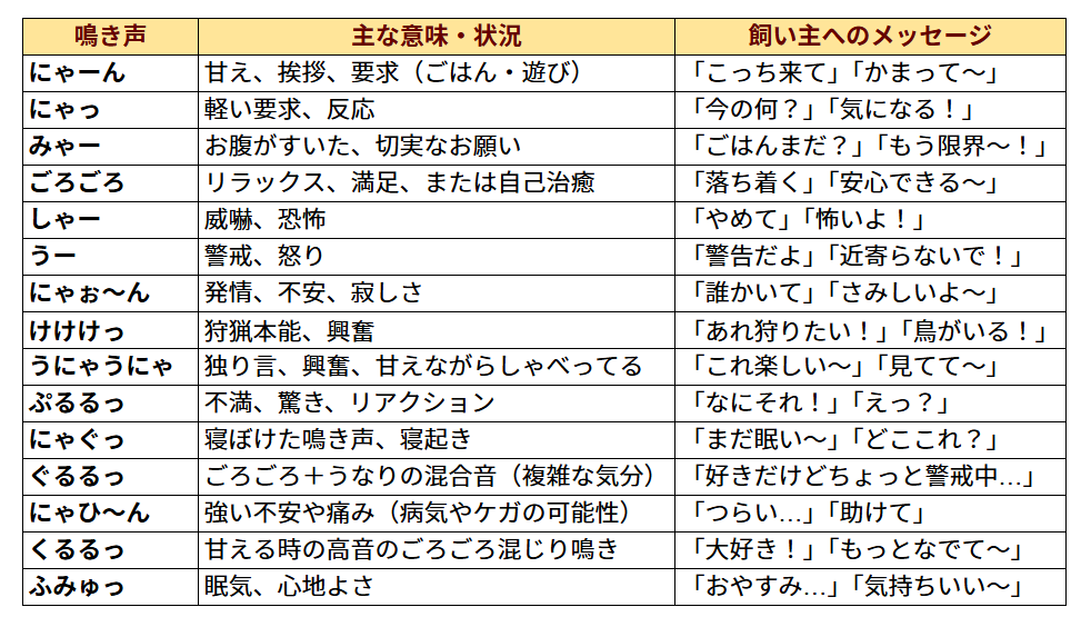 以下の表は、代表的な鳴き声とその意味をまとめたものです。