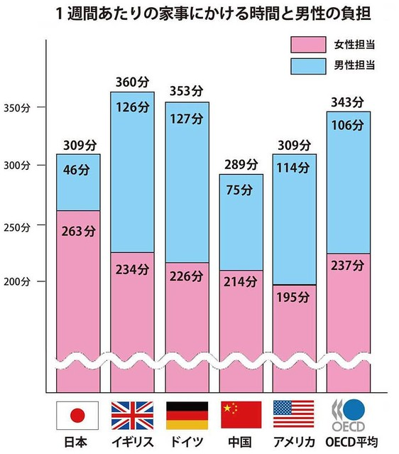 例えば、日本では1週間あたりの家事時間の合計が約309分ですが、そのうち女性が担当するのは約263分に対し、男性はわずか46分(2016年調べ)。OECD平均と比較しても、女性の負担は依然として大きく、男性の分担は少ないことがわかります。