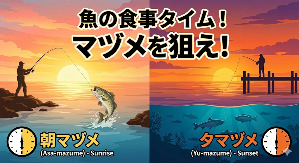 釣りの世界には**「マヅメ」**というゴールデンタイムが存在します。 これは魚にとっての朝食・夕食の時間。人間と同じで、魚もお腹が空いている時は活発にエサを追いかけます。