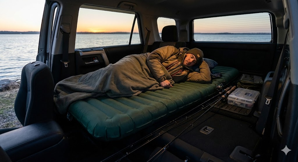多くの釣り人は、勝率を上げるために前日の夜に現地入りして車中泊(前乗り)をします。 しかし、車のシートには段差があり、熟睡できずに翌朝身体がバキバキ……なんてことも。これでは本末転倒です。