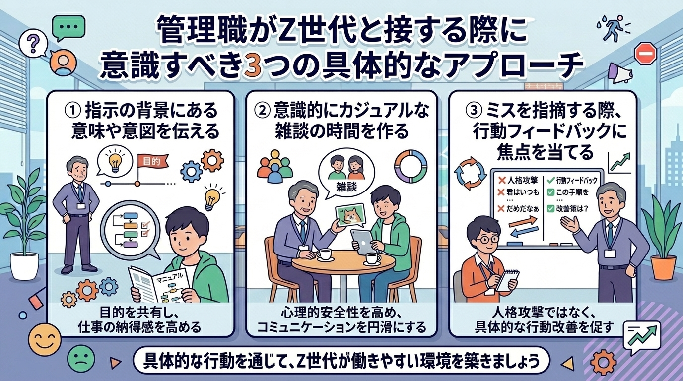 人格を責めるのではなく、行動に対するフィードバックを伝えることで、Z世代の成長を促せます。